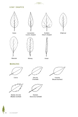 LEAF SHAPES Ovate Lanceolate Cordate Elliptical (Lance-shaped) (Heart-shaped) Obovate Oblong Linear MARGINS Entire Serrate Crenate (Toothed) (Round toothed) Doubly-Serrate Dentate (Doubly toothed) (Coarsely toothed) 18 GL OSSAR Y